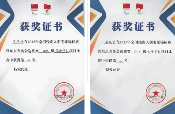 2025年6月全国残疾人羽毛球锦标赛暨东京聋奥会选拔赛(湖北武汉)单打第3名 双打第一名